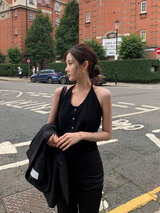 Oct. 友好疊穿 針織排扣後背挖空背心 黑