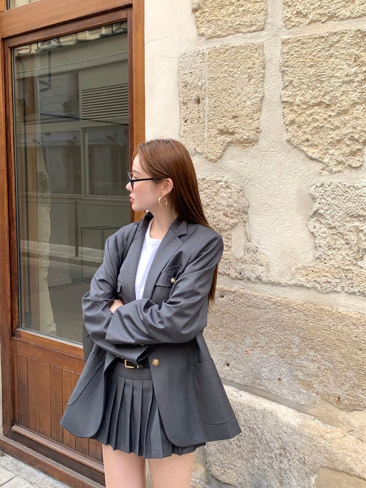 Oct. 復古學院preppy look簡約寬鬆西裝外套 百摺裙 灰