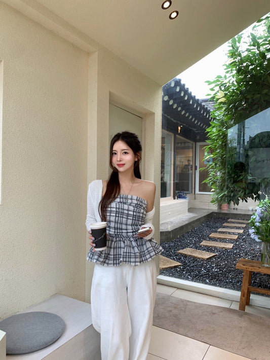 Oct. 復古格紋 韓女抹胸顯瘦泡泡擺上衣 黑/白