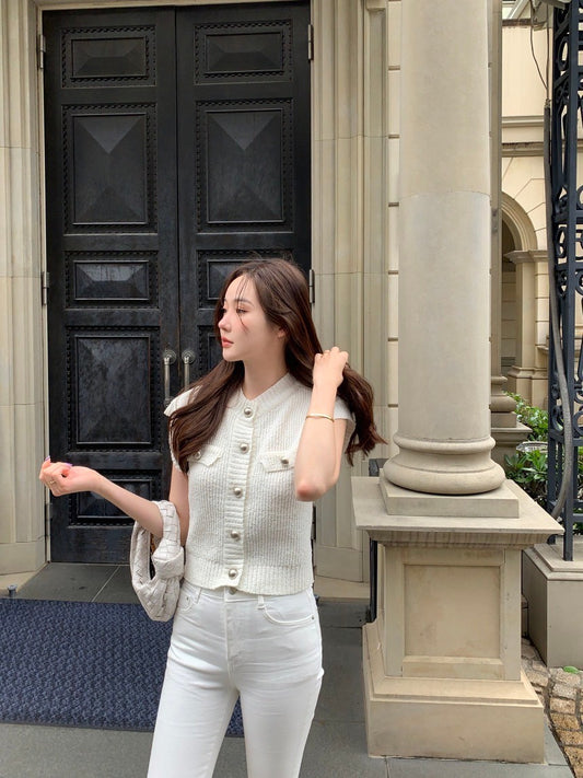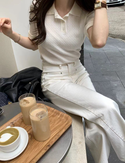 Oct. 溫柔小香 軟糯粗針排釦短袖上衣 米白