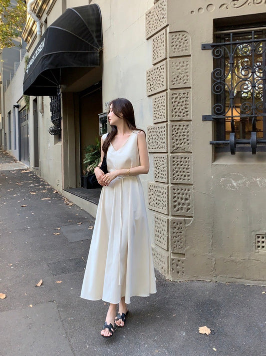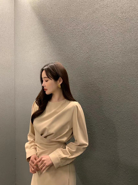 Oct. 極簡優雅 V領寬帶飄摺連身裙 米色