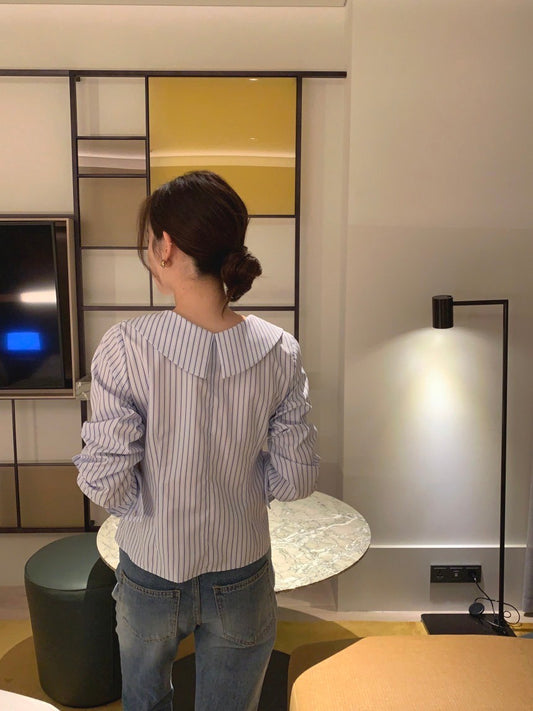 Oct. 復古chic 職場通勤百搭翻領水滴扣修身襯衫 藍