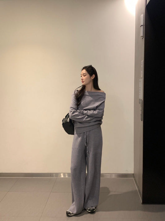 Oct. 美式休閒 百搭純色一字肩寬鬆上衣 休閒褲針織針織套裝 灰
