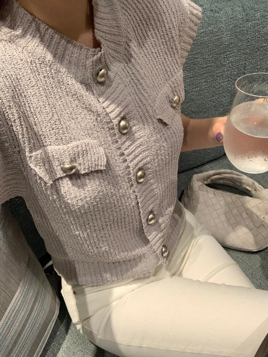 Oct. 溫柔小香 軟糯粗針排釦短袖上衣 灰/黑