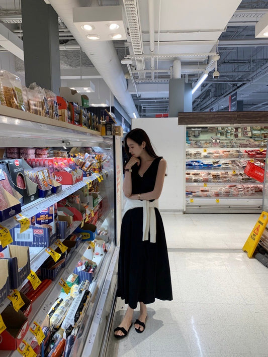 Oct. 極簡優雅 V領寬帶飄摺連身裙 黑色
