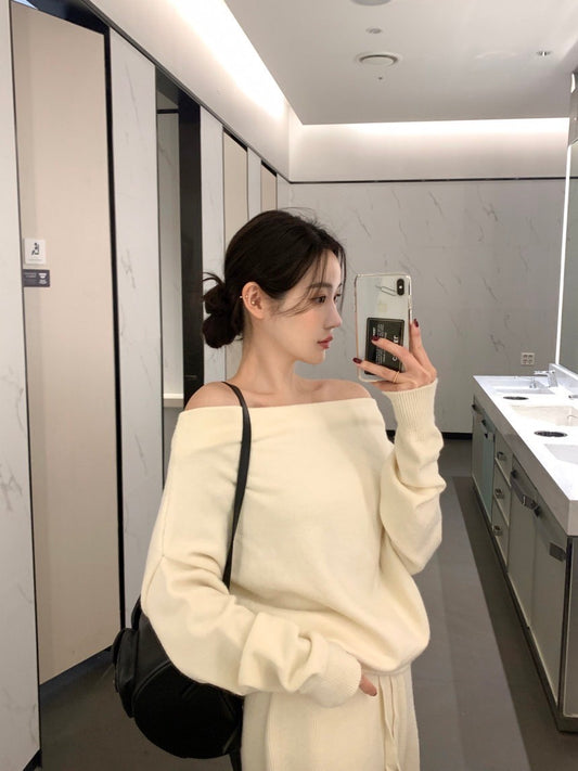 Oct. 美式休閒 百搭純色一字肩寬鬆上衣 休閒褲針織針織套裝 杏/黑