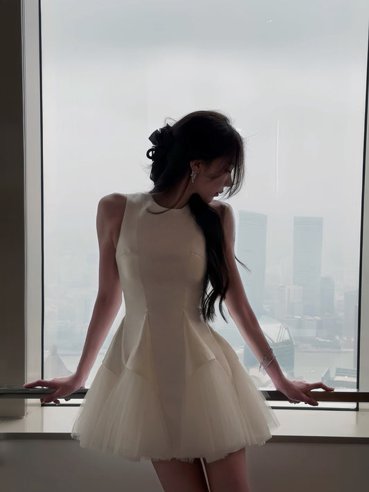 Sep. 高級歌劇天鵝湖 網紗拼接珠光面背心連身裙 白