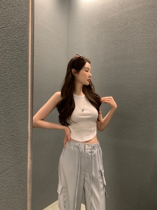 Jul. 涼爽夏日休閒百搭口袋鬆緊工裝褲 淺灰