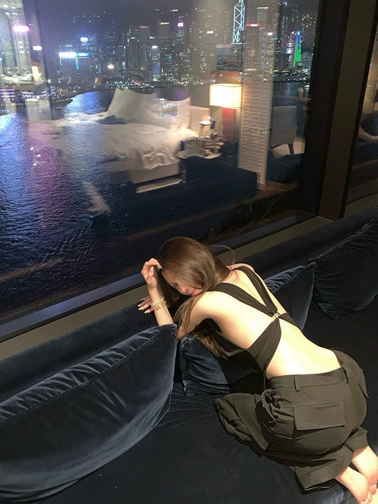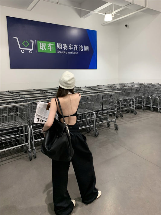 Jun. 歐美辣妹top高腰連體背心 鬆緊休閒褲 黑