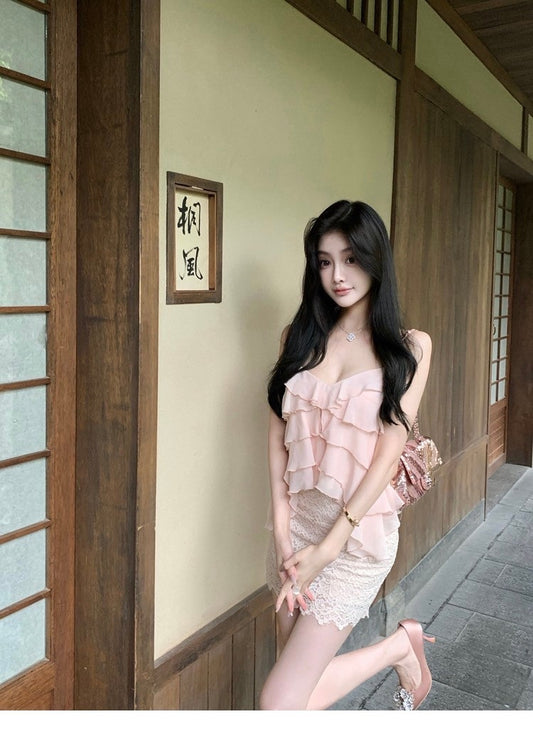Oct. 雪紡蛋糕荷葉 氣質顯瘦吊帶背心 人魚粉