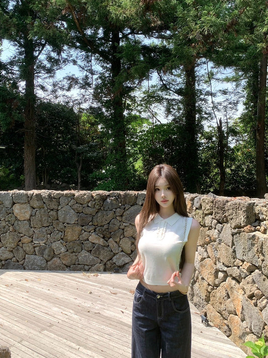 Jun. 大膽穿韓系學院polo領好版型無袖鈕扣背心 白/灰