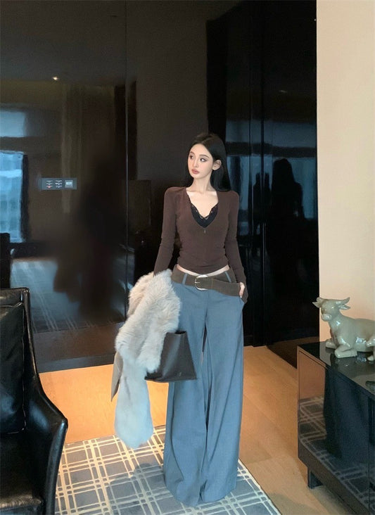 Jan. 質感過冬 V領百搭打底咖色長袖上衣 設計款中腰直筒褲