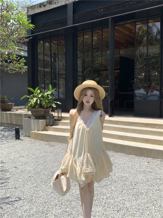 Jun. 花語呢喃 露思款甜美V領洋裝 奶黃 (蕾絲背心單獨選購)