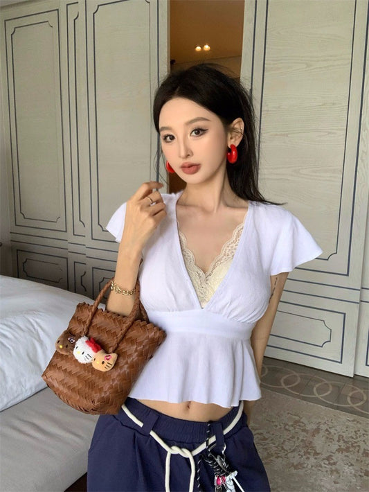Apr. 法式復古V領收腰短袖白色上衣 奶黃蕾絲內搭