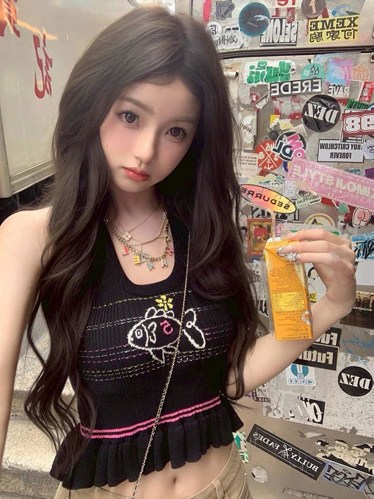 Jun. 童趣魚兒刺繡 收腰花瓣針織背心 黑
