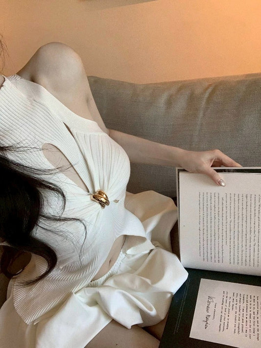 May. 千金即視感 貴氣高奢小巴扭結縷空針織背心 白
