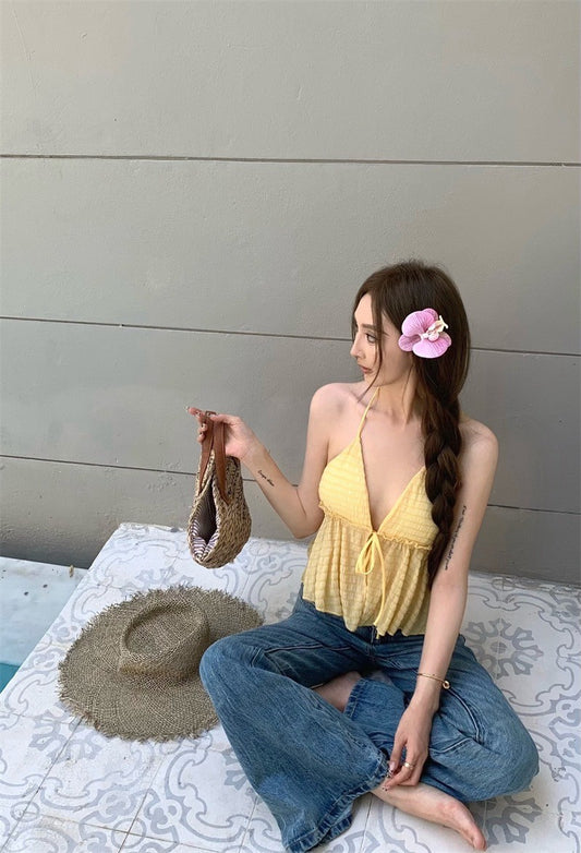 Mar. 俏皮夏日趣 度假風挖背綁帶肌理紋背心 黃