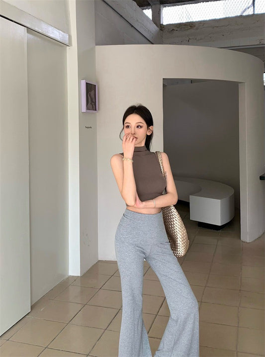 Apr. 復古辣妹 削肩挖背顯瘦背心 麻花反折針織喇叭褲 灰