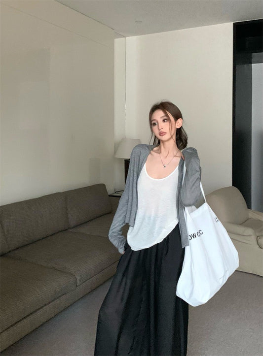 Jun. 美式慵懶遛彎三件 灰色開衫 白/黑背心 黑色休閒褲