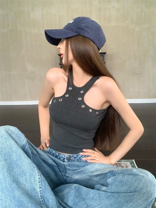 Sep. 歐美辣妹 銀釘挖肩顯瘦彈力背心 灰