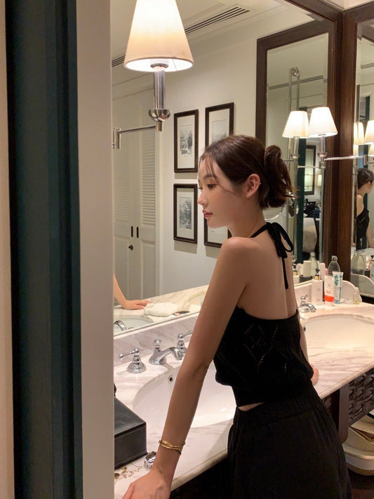 Aug. 法式簡約 菱格紋縷空後背性感心機背心 黑色