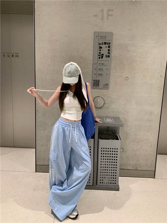 Aug. 運動日 淺藍抽繩可調口袋休閒褲 復古連帽挖背背心