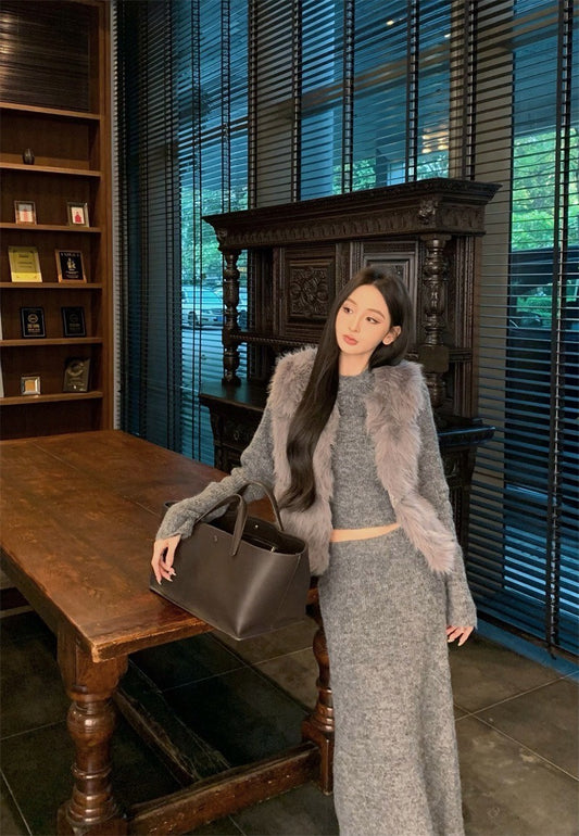 Jan. 氣質貌美 溫柔正肩修身針織上衣 魚尾半身裙 同色系仿貂馬甲 深灰