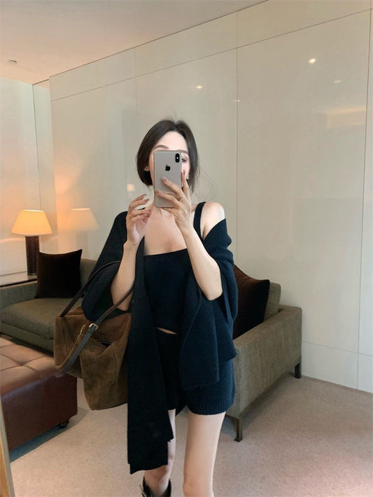 Feb. 溜灣套裝 氣質披肩背心短褲針織三件套 黑
