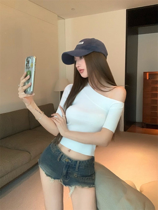 Sep. 休閒百搭 針織螺紋針織斜肩彈力上衣 白 顯瘦低腰牛仔短褲