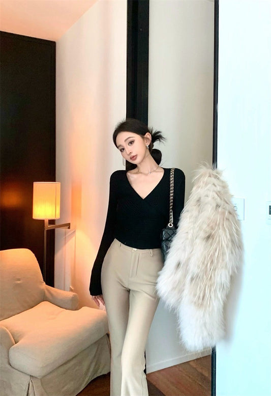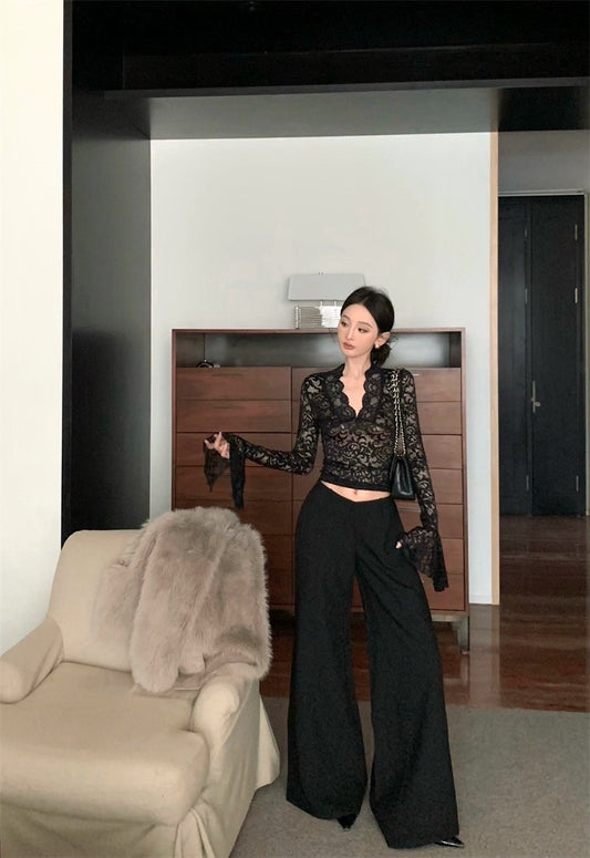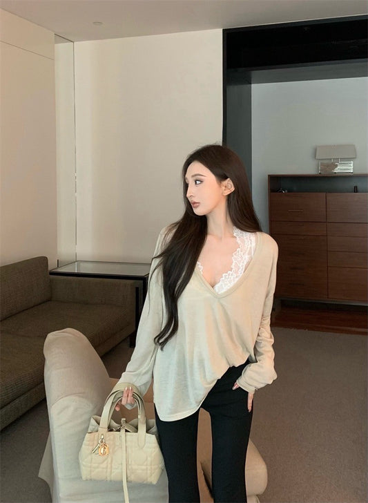 Sep. 純欲蕾絲打底穿搭 休閒百搭打底長袖上衣 杏 反摺蕾絲拼接顯瘦休閒褲 黑色