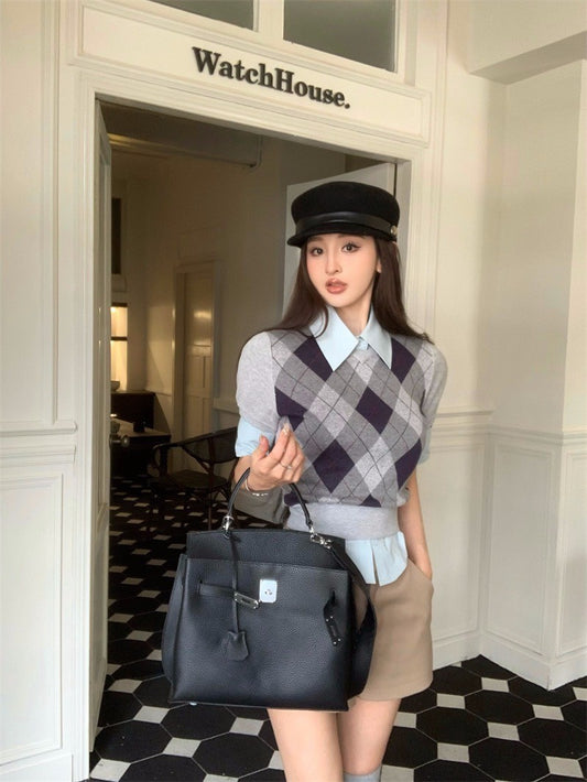Oct. 設計學院 復古英倫疊穿針織 格紋 藍色襯衫