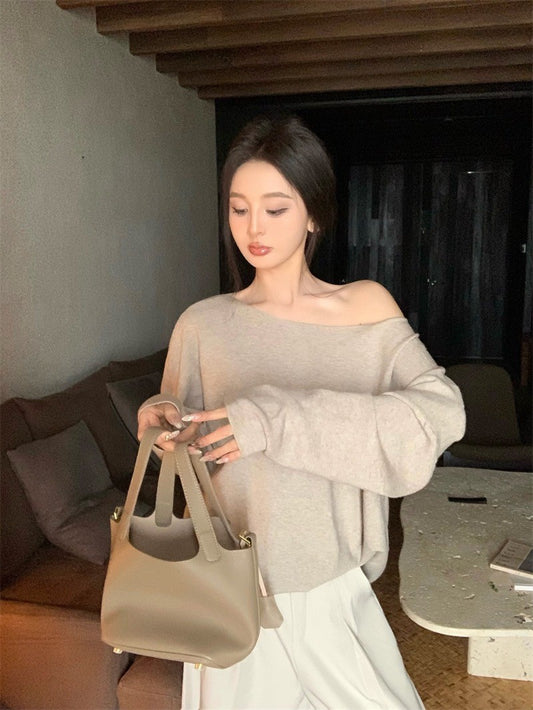 Oct. 隨性出門 慵懶斜肩杏色毛衣 百搭闊腿褲 卡色