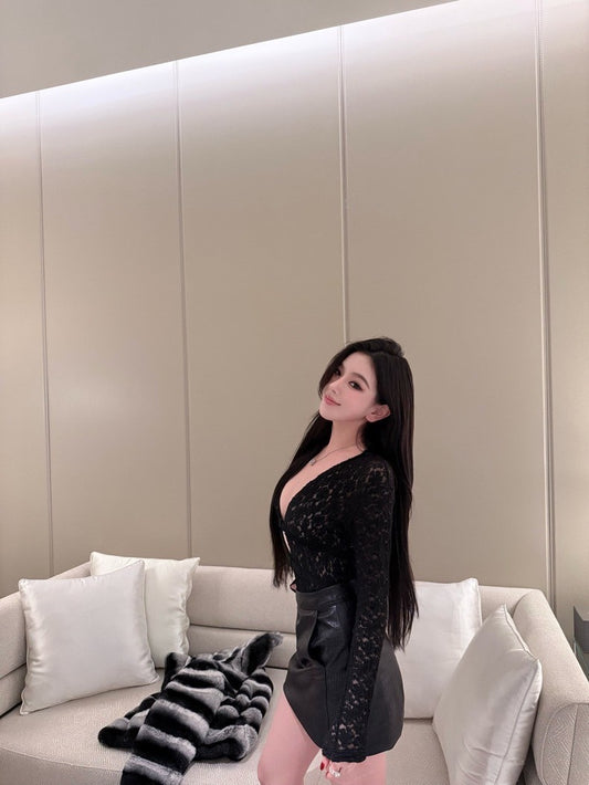 Jan. 雪芙蕾絲2.0 極致深V性感修身七分袖緹花上衣 黑