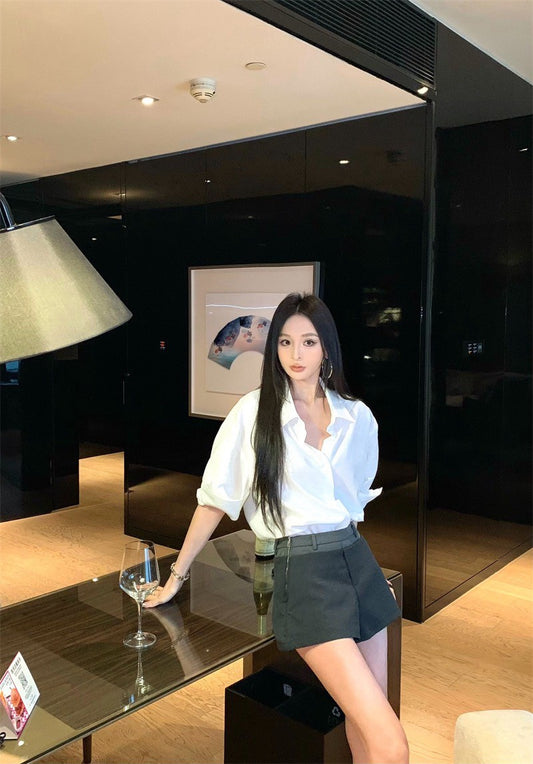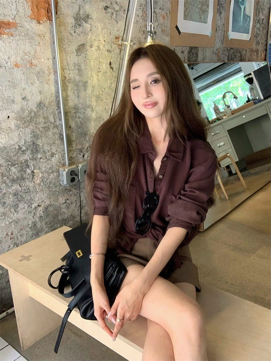 Oct. 港風酷颯 個性修身咖色襯衫 咖色修身短褲