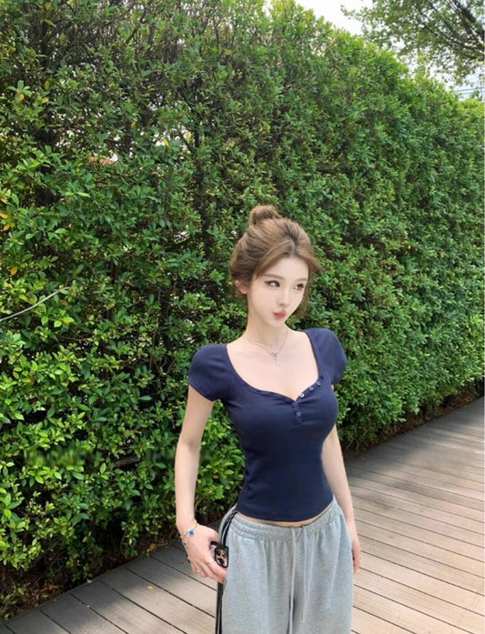 Apr. 嫩妹天菜 多色多囤!桃心領性感短袖上衣 藏藍/灰色