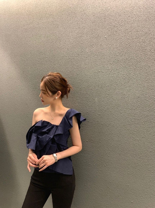 Aug. 斜肩荷葉邊斜肩上衣 黑色