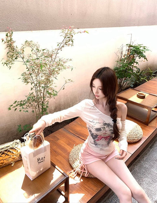 Aug. 純欲甜辣 貓咪斜肩修身上衣 綁帶粉色短褲
