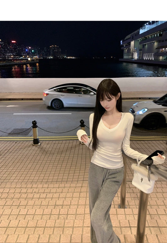 Aug. 好身材 V領修身柔軟百搭彈力上衣 白/灰