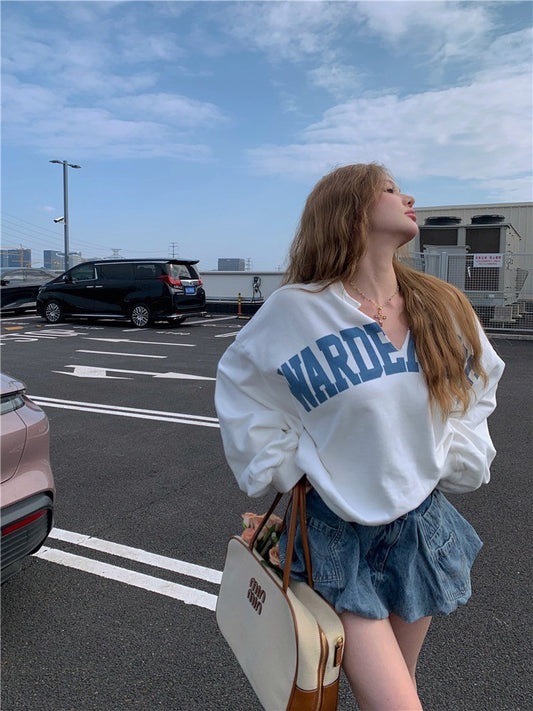 Nov. 青春洋溢 藍白字母寬鬆上衣 牛仔花苞半身裙
