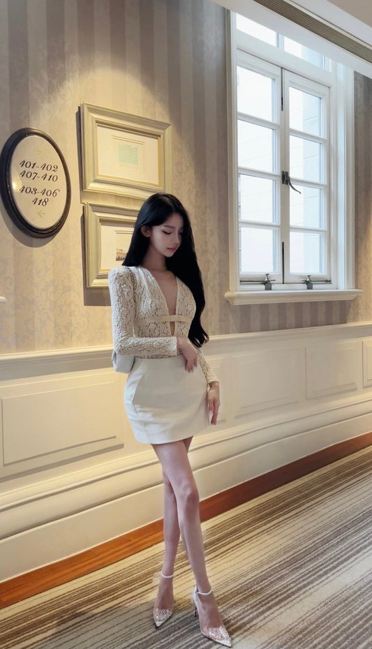 Dec. 雪芙蕾絲2.0 極致深V性感修身七分袖緹花上衣