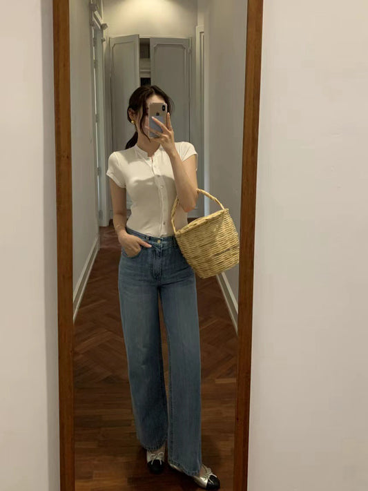 Jul. 休閒簡約單排扣短袖上衣 灰/白/卡其