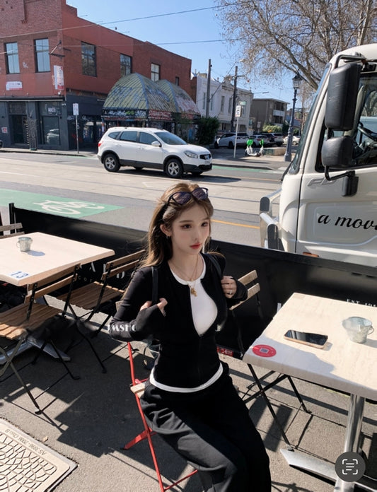 Jan. 心動符號 心機V領繡花打底喇叭袖上衣 黑 同色系休閒褲