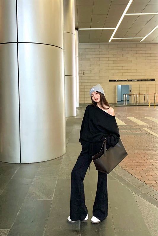 25Jul. 美式時髦穿 休閒純色上衣喇叭褲套裝 黑