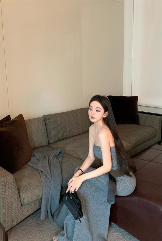 Jan. 東方美人 優雅氣質抹胸針織連身裙 外套裝 灰