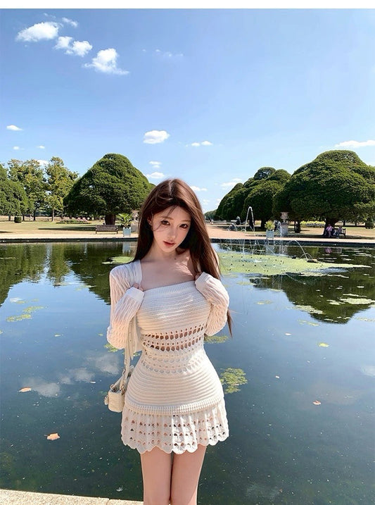 25Oct. 氣質浮雲立體縷空針織連身裙套裝 白