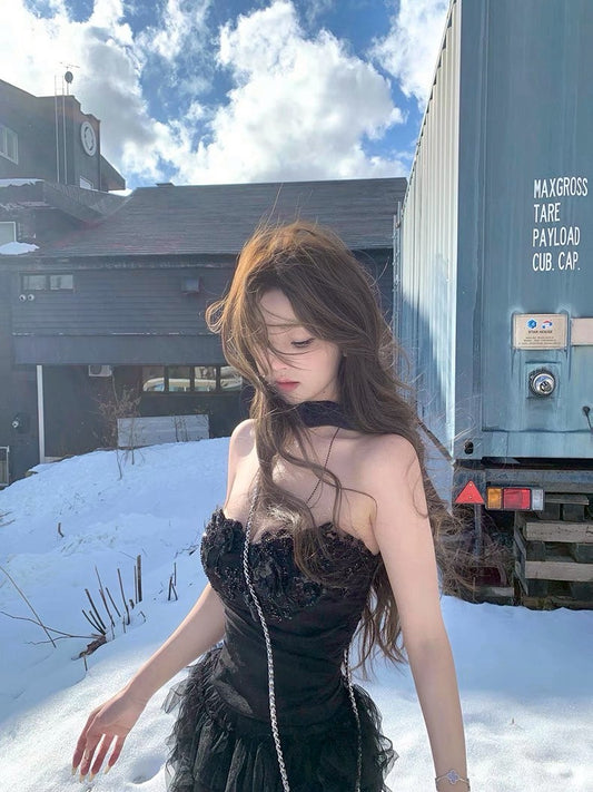 Jun. 玫瑰廢墟 氣質優雅手工花網紗蛋糕裙套裝 黑