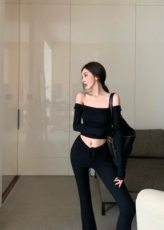 25Aug. 手稿作業UK-girl一字領撞色休閒褲套裝 白黑