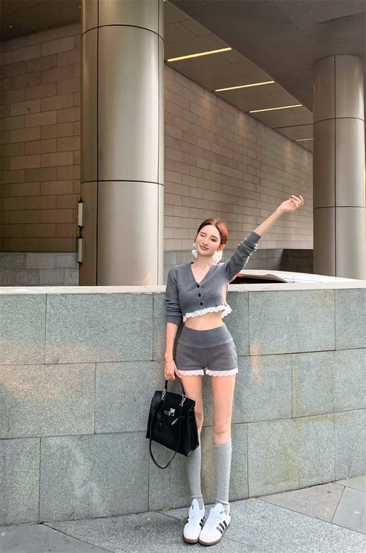Feb. 青春特輯 花邊拼接V領針織短褲套裝 灰