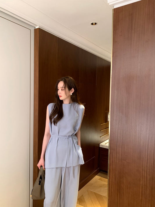 Jul. 高貴優雅歐膩 圓領繫帶上衣 高腰休閒褲套裝 藍