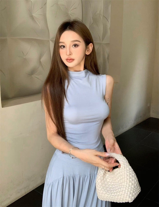 Sep. 氣質百搭純色高領背心半身裙套裝 藍色/卡其